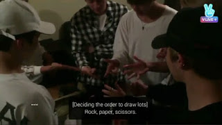 Mereka main kertas-gunting-batu dan sumveh mereka main sampe 15 kali baru ketemu pemenang pertama Jin sama Jhope