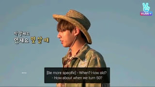 Jhope Cuma ketawa (yahhh bang.. kalo kalian balik lagi kesini umur 50 tahun, kalian udah gak jomblo lagi. Kalian udah punya anak istri :’) jadi mereka pasti kalian ajak juga :” kok nyesek yah :v)