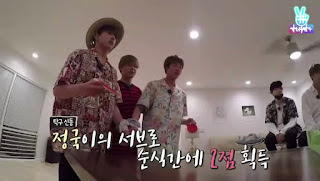 Rapmon bilang "Hopie, ayo kita coba karena mereka ada 3 member (nunjuk timnya jungkook) jangan pikirkan apa2. Hanya pukul bolanya, jangan pukul bola terlalu keras"