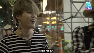 Jimin-Rapmon masih nunggu burer yangbelum dateng juga selama 5 menit, rapmon manggil si Taehyung “Taehyung-ah, sudah lebih dari 5 menit”