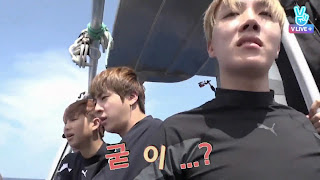 Si maknae b ilang “kau ingat yang aku katakan? Jika ada hiu mendekat kau tinggal gigit hidung seperti ini” (mraktekin haha)