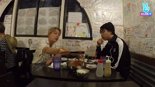 Oh mereka ini dibagi timnya di episode sebelumnya, jadi ada Jimin-Jin-Jungkook, Suga-Taehyung, Rapmon-Jhope buat makan malam