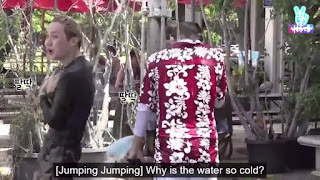 Tapi jhope dengan nakalnya lari ke arah Jimin sama member lain, yaa kalian pasti tau lahh kalo misal kalian kena hukuman suruh masuk air pasti kalian juga pengen narik orang lain biar ikutan basah :v