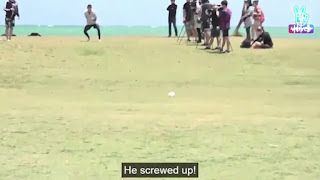 Jimin mulai ngelempar dan itu jauh bangett sampe member pada terkejoedh :v (lari aja keren :(